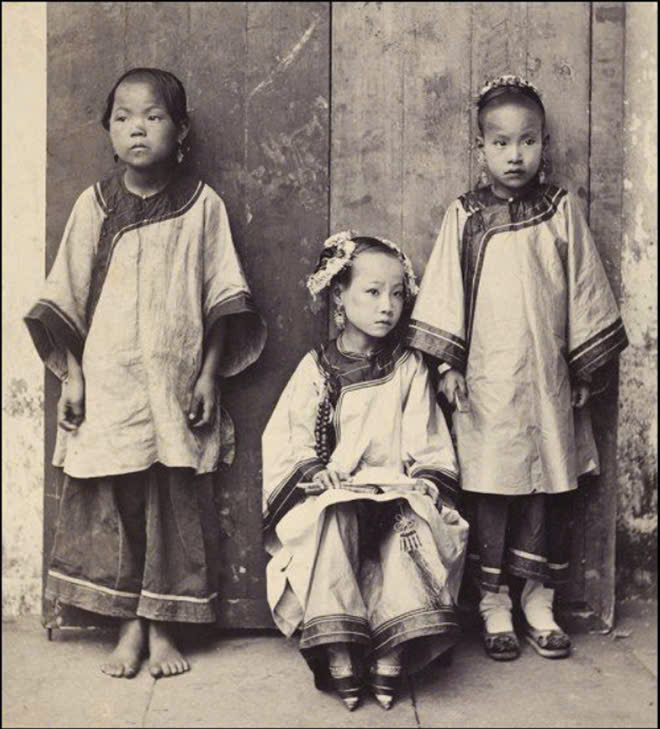 Khuôn mặt sáng sủa, quần áo tinh tươm cùng loạt trang sức tinh xảo đã khẳng định địa vị khác biệt của cô bé so với hai người còn lại. Tuy nhiên, điều khiến người xem rùng mình lại nằm ở đôi bàn chân nhỏ xíu bị bó chặt trong đôi hài thêu. Đây chính là “gót sen”, biểu tượng sắc đẹp đồng thời cũng là nỗi ám ảnh của phụ nữ Trung Hoa phong kiến.
