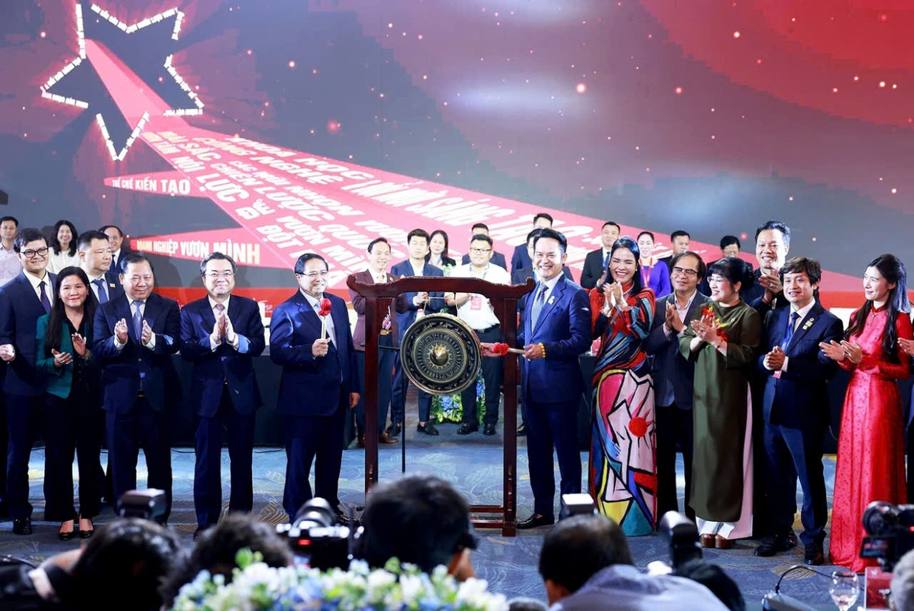Thủ tướng Phạm Minh Chính tiến hành nghi thức đánh cồng khởi động một giai đoạn phát triển mới tại Diễn đàn kinh tế tư nhân Việt Nam 2025 - Ảnh: TTXVN
